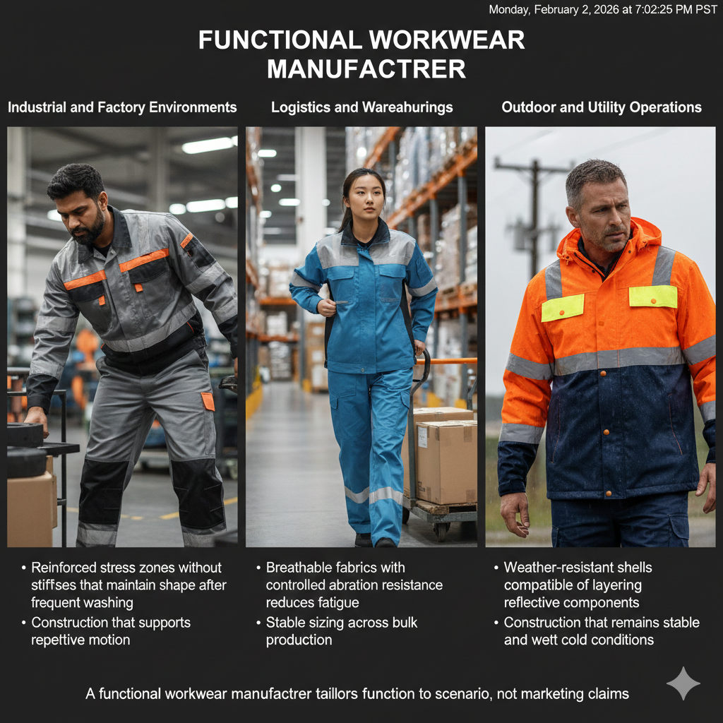 Functional workwear is designed around use behavior. Movement patterns, exposure time, environmental stress, and laundering frequency all influence which functions matter and how they should be prioritized.